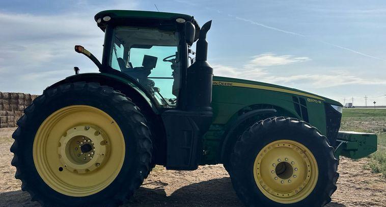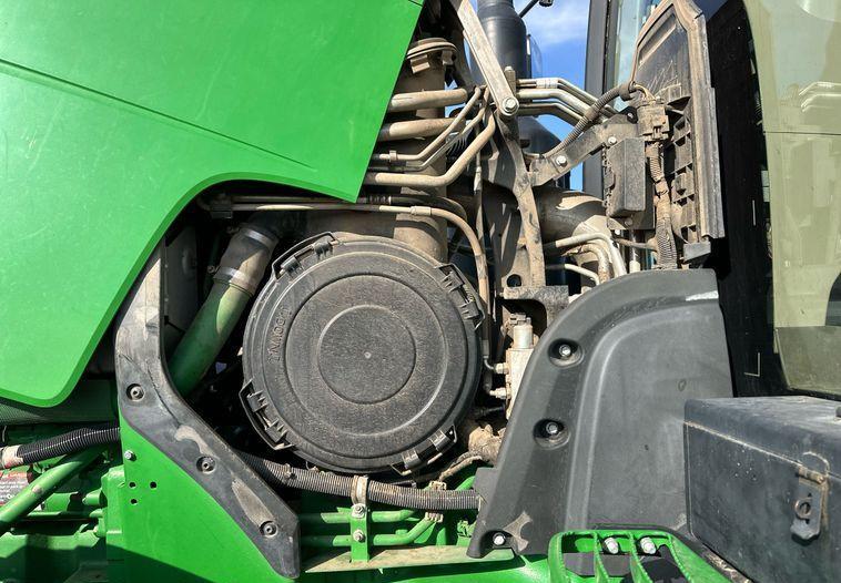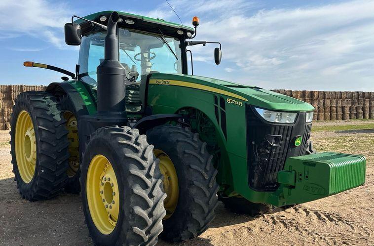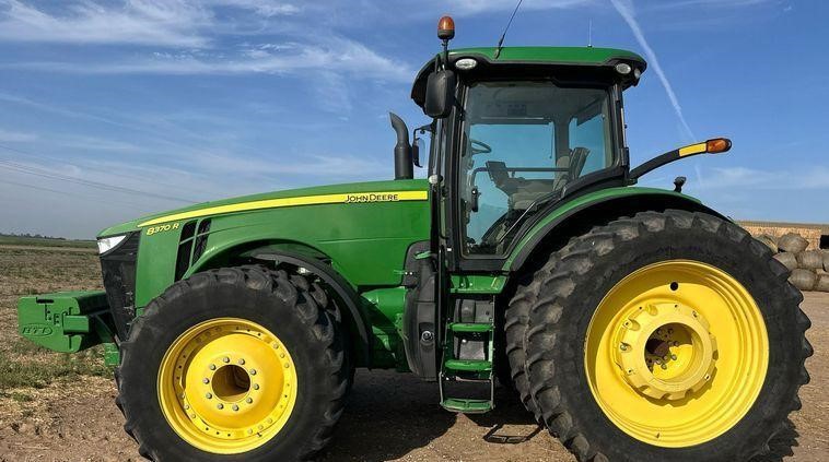 This 2016 John Deere 8370R MFWD tractor has 6,097 hours on the meter and is powered by a 9.0-liter, 6-cylinder John Deere PowerTech PSS diesel engine. It features a Powershift transmission with 23 forward and 11 reverse speeds, along with a differential lock for improved traction and control.