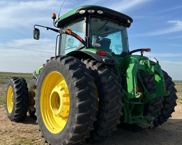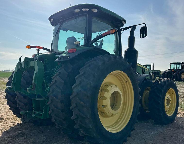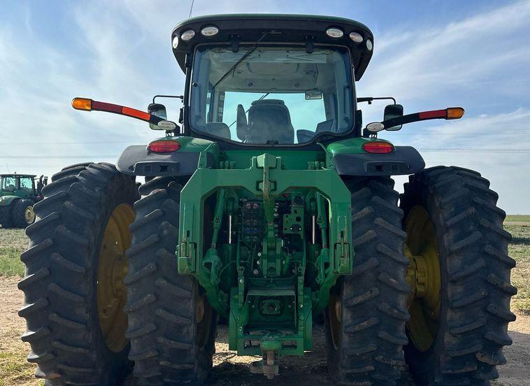Hydraulic capabilities include five rear remote sets and power beyond for versatile hydraulic functions. It comes with 22 suitcase weights to improve stability and traction. Tires measure 420/85R34 in the front and 480/80R50 in the rear, with duals installed for additional ground contact and performance.