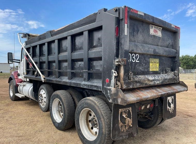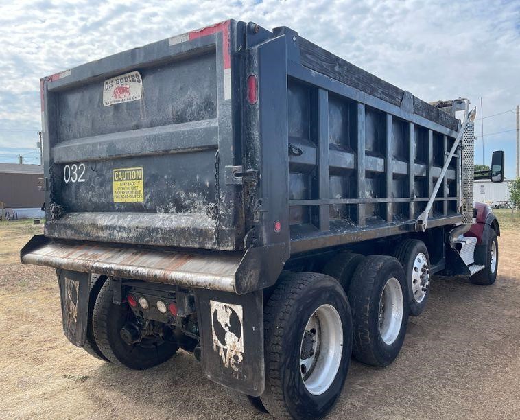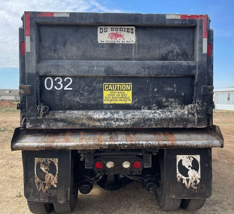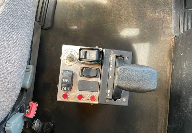 The dump bed measures 17 feet long by 96 inches wide, with a side height of 51 inches and side boards 8 inches high. The bed is made of steel and features a bed vibrator, roll tarp, single ram, and air-operated end gate.