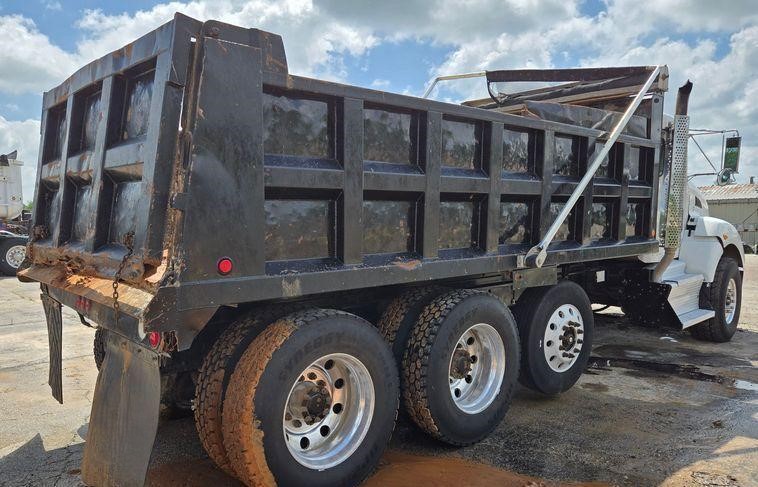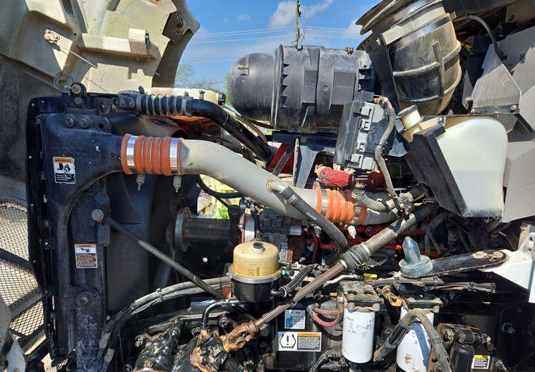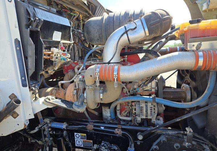 The chassis includes triple axles with a pusher axle, air suspension, dump valves, and air brakes. It has a power take-off (PTO) and a gross vehicle weight rating (GVWR) of 66,000 pounds. The front axle weight rating (FAWR) is 16,000 pounds, the intermediate axle weight rating (IAWR) is 20,000 pounds, and the rear axle weight rating (RAWR) is 20,000 pounds. The lift axle has a gross axle weight rating (GAWR) of 10,000 pounds.