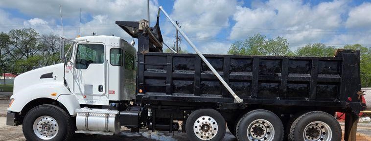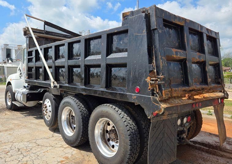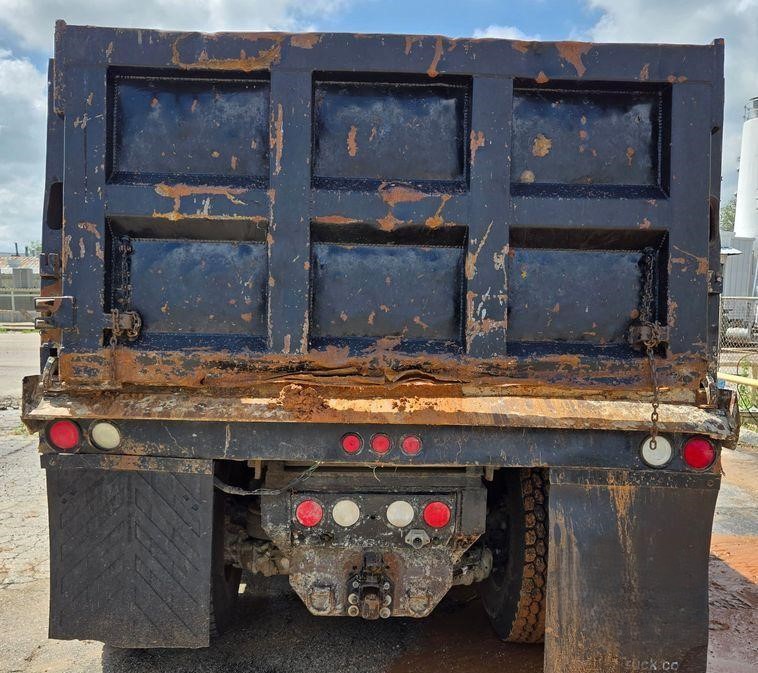 Inside, the truck has air conditioning, heat, power windows, and cruise control. The dump bed measures 17 feet long by 96 inches wide with a side height of 45 inches. The bed is made of steel and includes a roll tarp, single ram, and an air-operated end gate. Tires on the front are 425/65R22.5, rear tires are 11R24.5, and lift axle tires are 295/75R22.5.