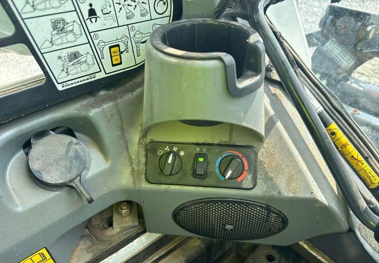 The operator's station is enclosed and climate-controlled with air conditioning and heating for comfort in all conditions. Bucket control is hand-operated, and the machine is equipped with auxiliary hydraulics, an auxiliary electrical outlet, and a hydraulic quick coupler for versatile attachment use. Counterweights enhance stability during operation.